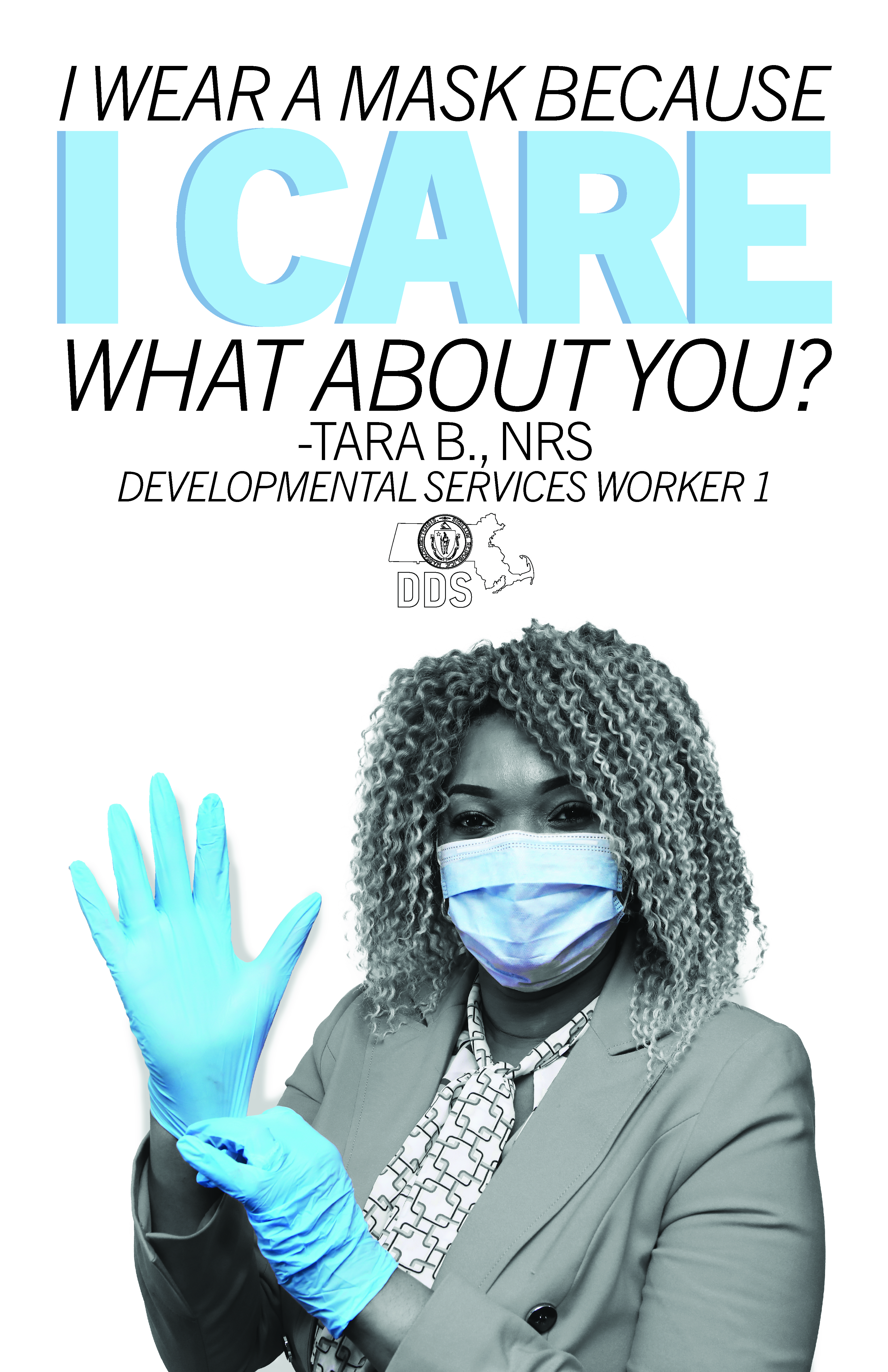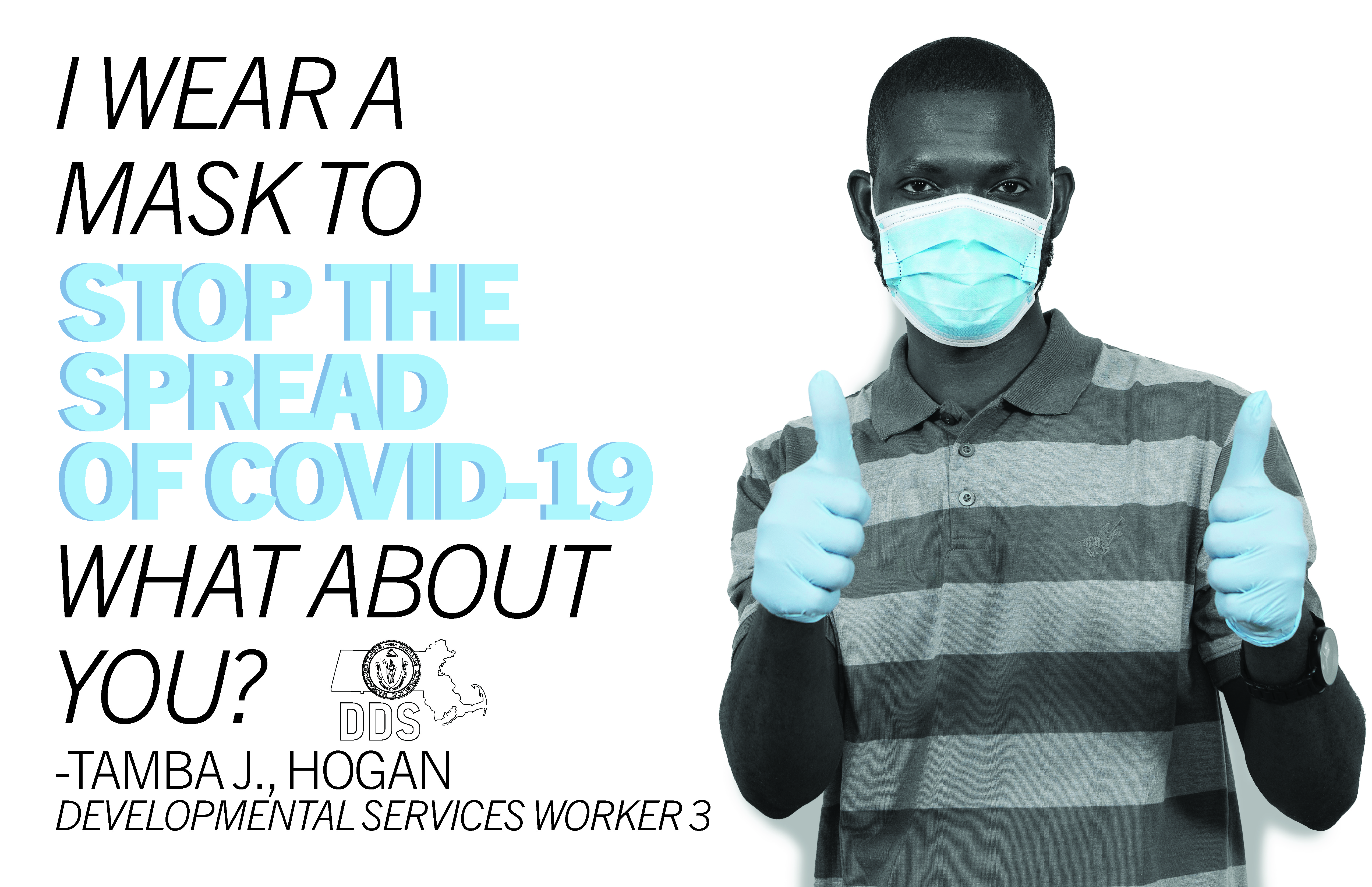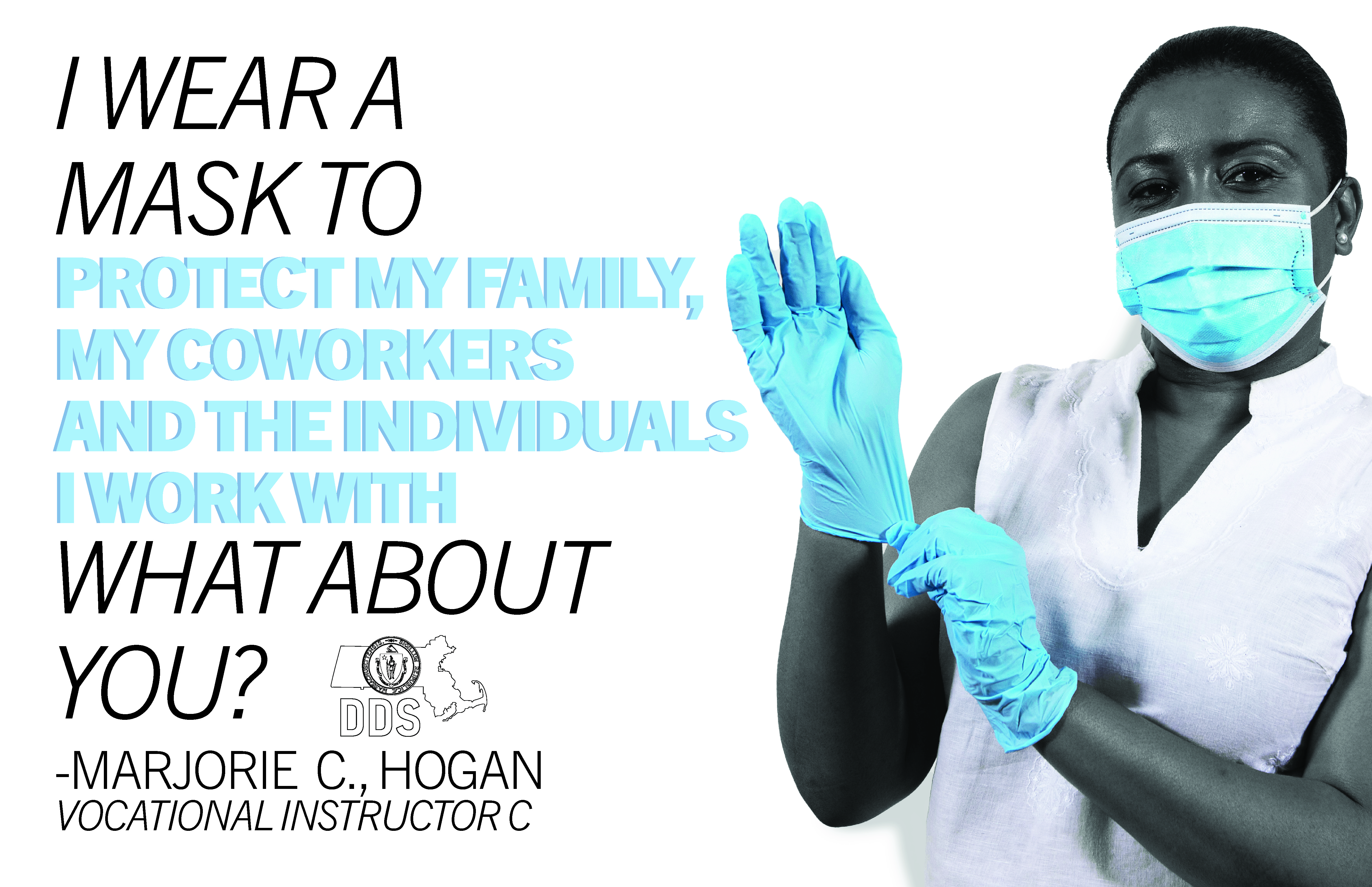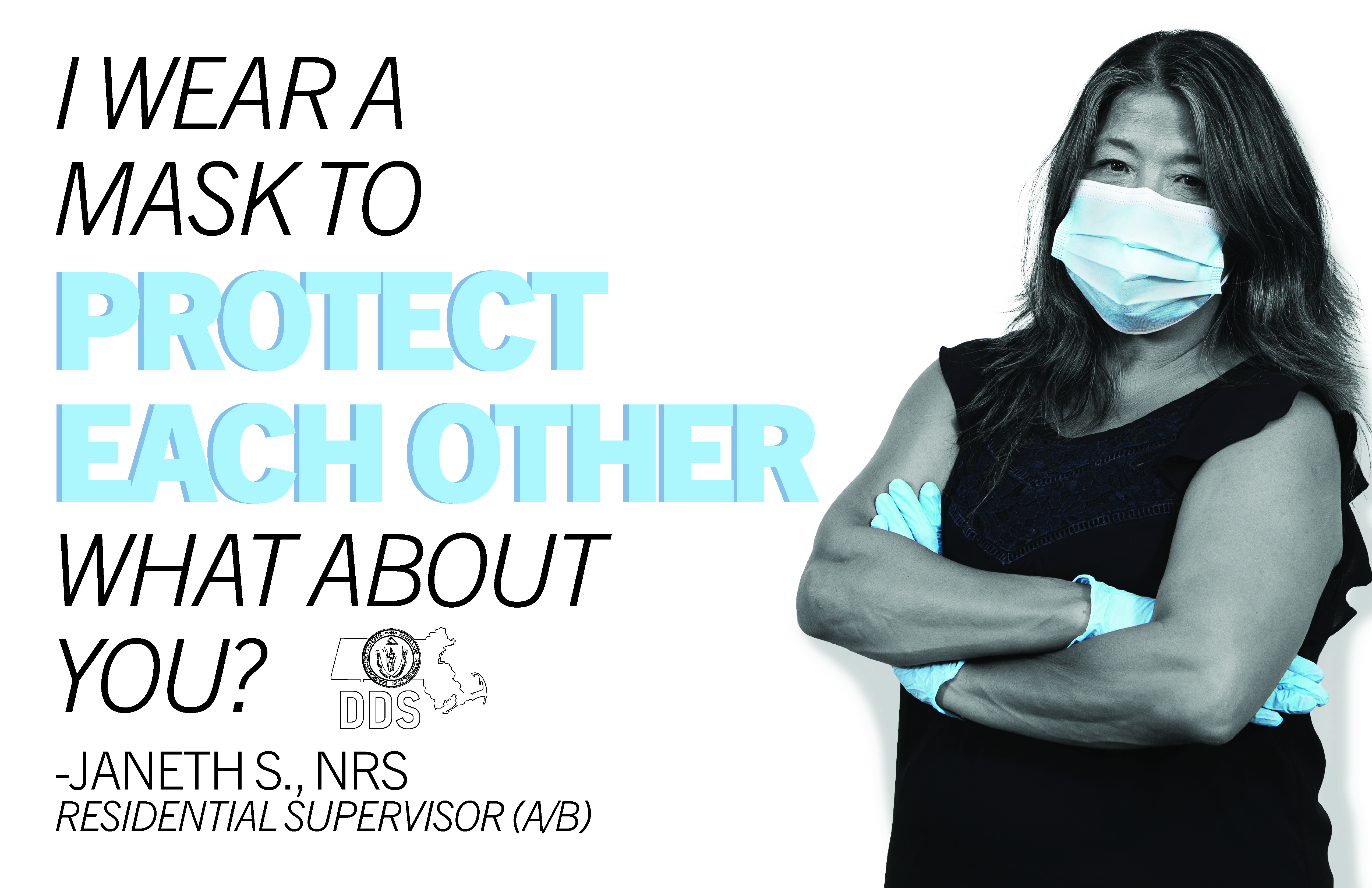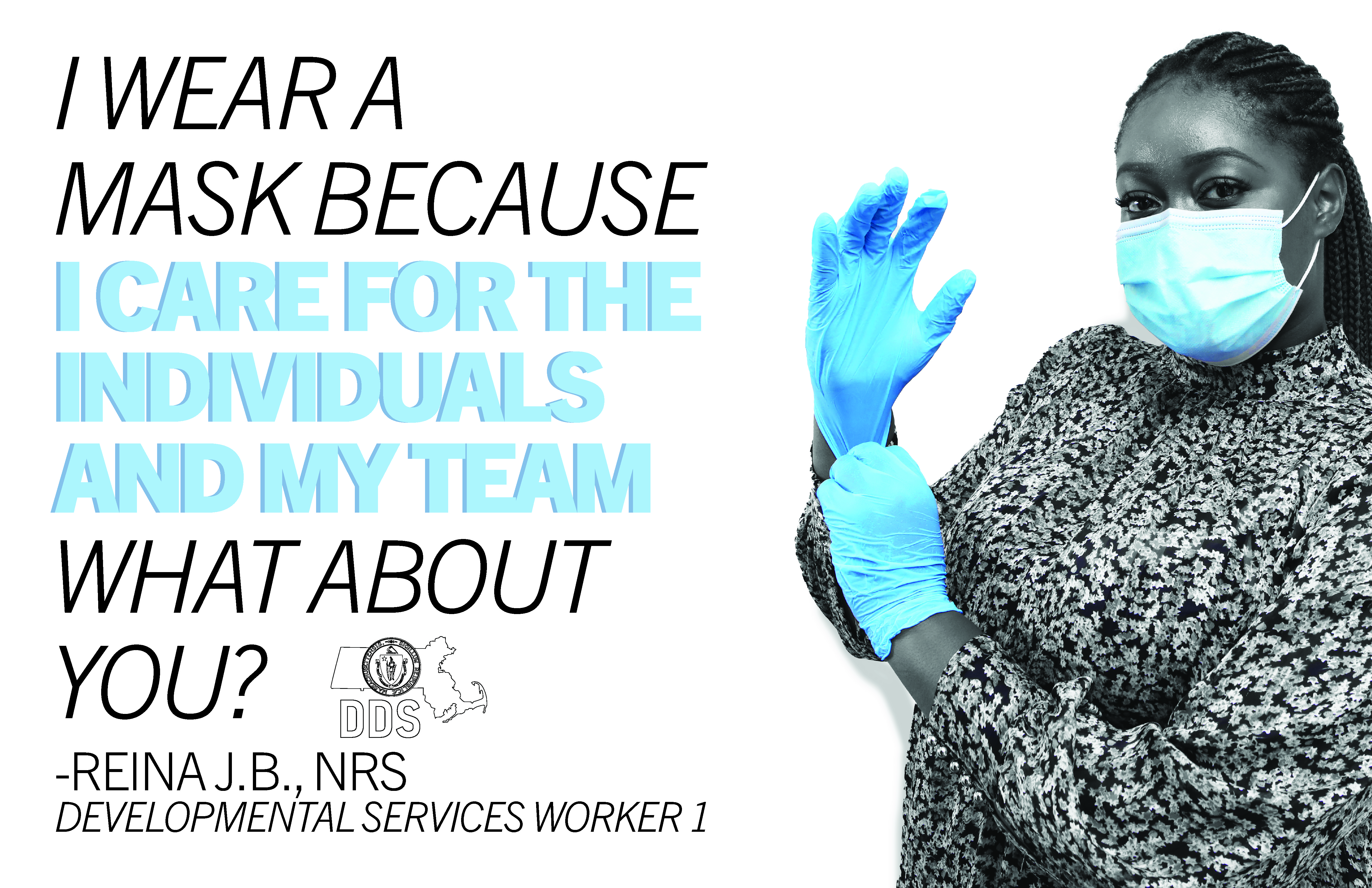 With this goal in mind, I designed a series of posters using photos of DDS employees wearing PPE, and their reasons for wearing masks. To draw attention to the PPE and the individual reasons, I made the posters all black and white, except for the emphasized elements, which show up in the same color blue as the masks.