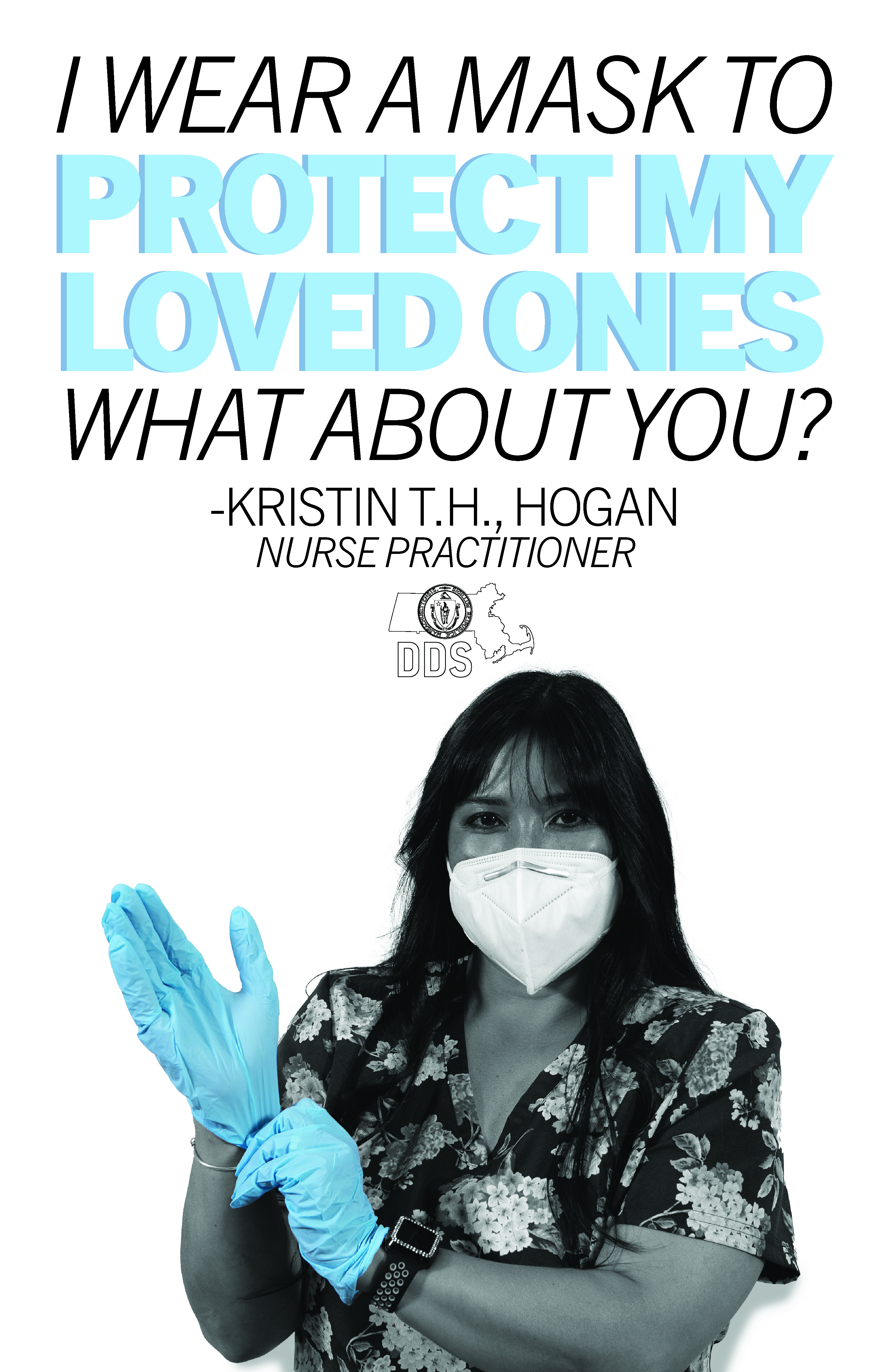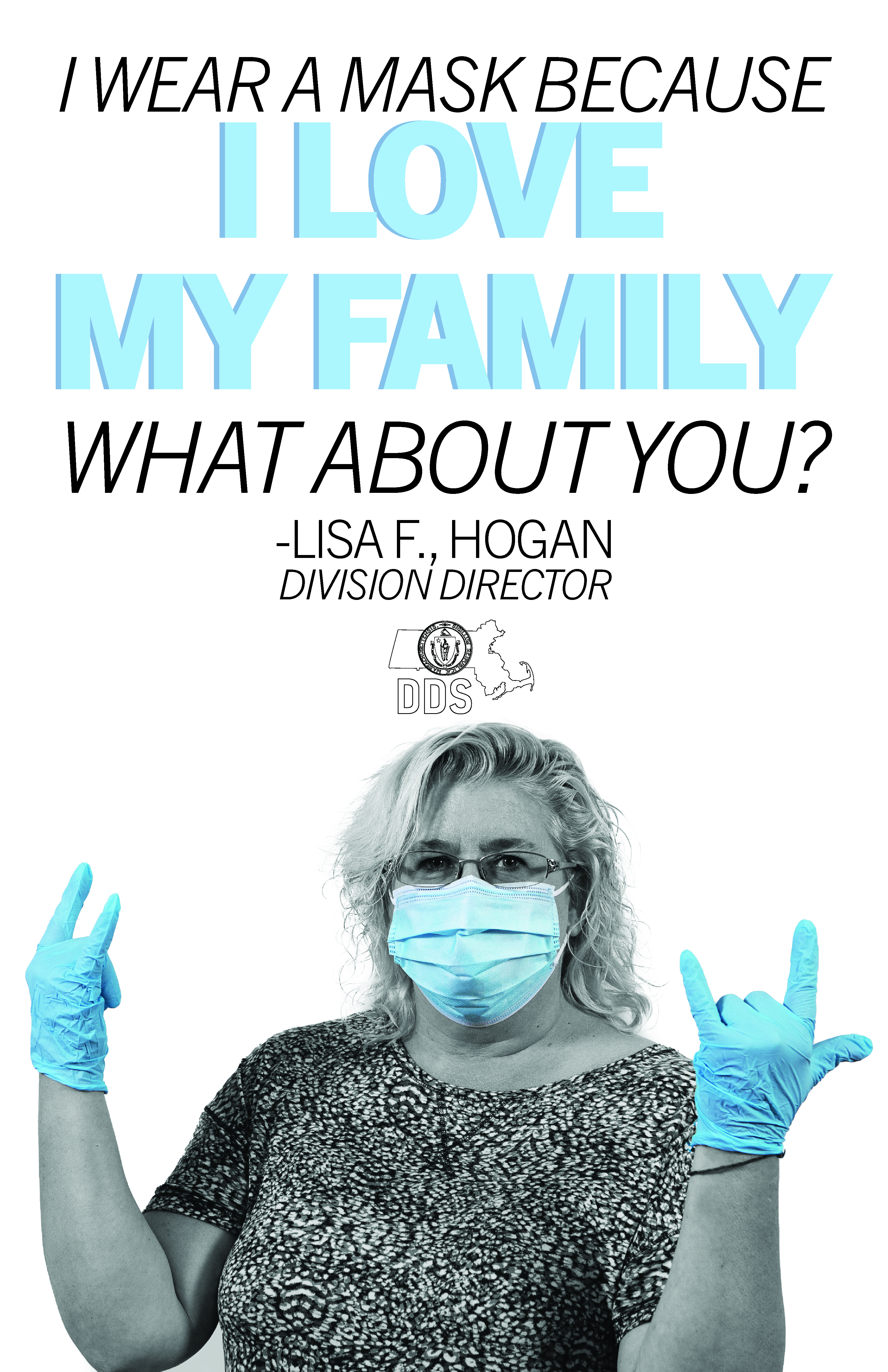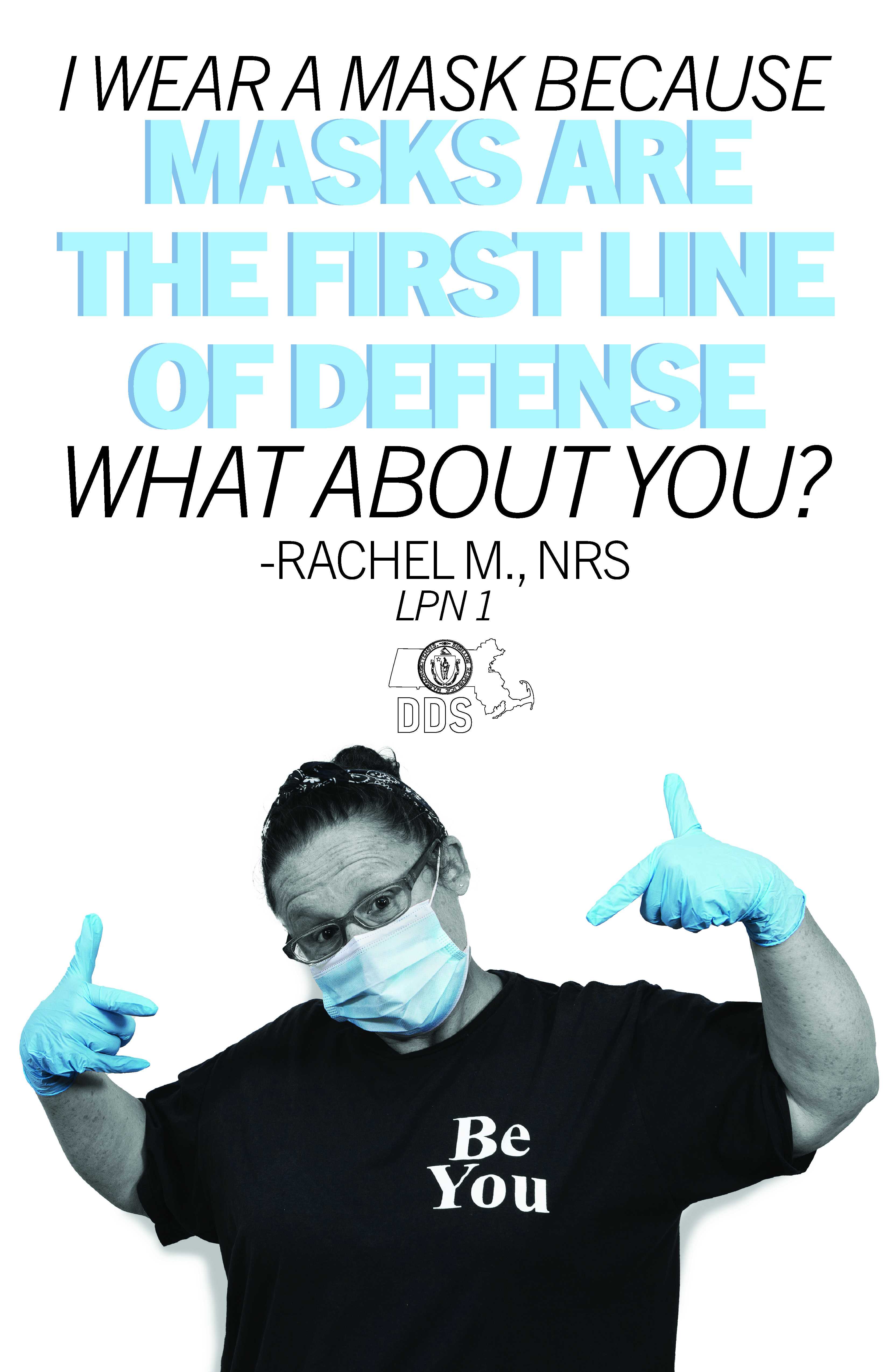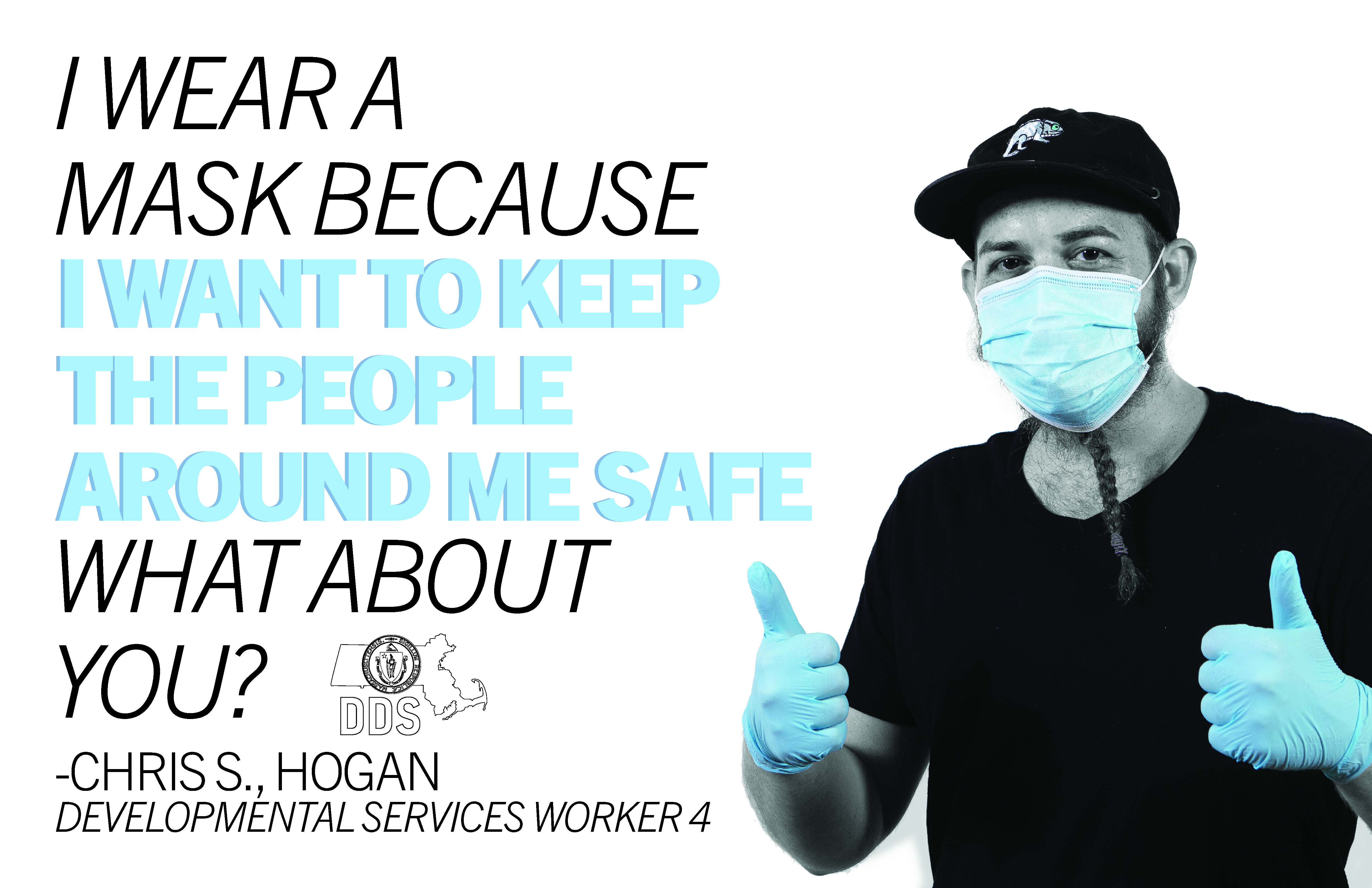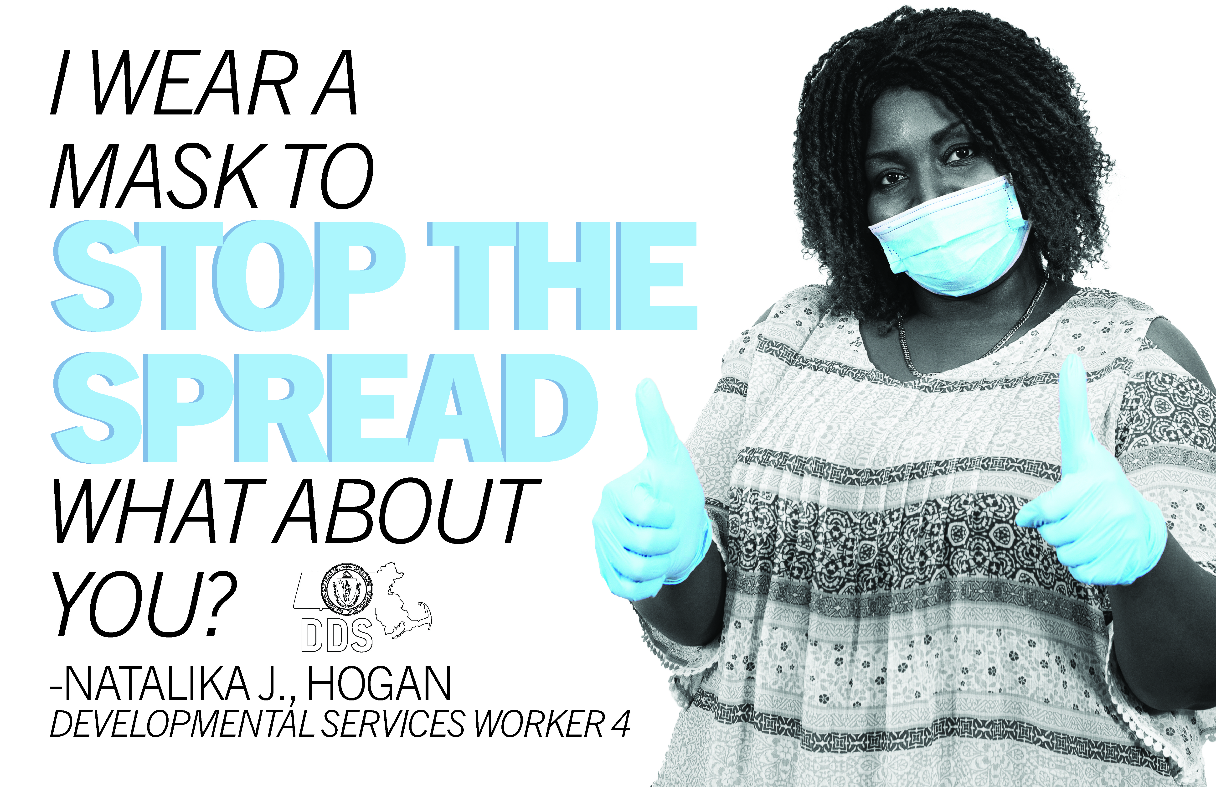With this goal in mind, I designed a series of posters using photos of DDS employees wearing PPE, and their reasons for wearing masks. To draw attention to the PPE and the individual reasons, I made the posters all black and white, except for the emphasized elements, which show up in the same color blue as the masks.
